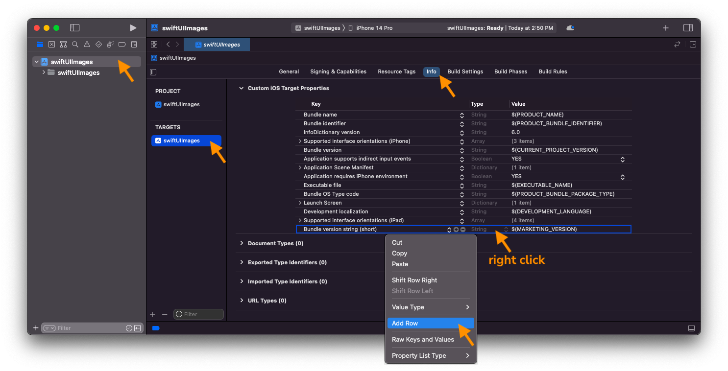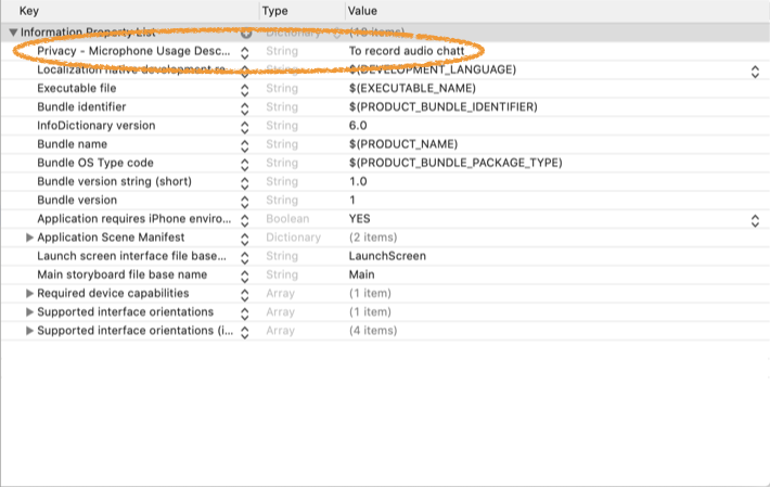 To record audio, we need user’s permission to access the device’s microphone. Add justification to use the microphone to your Info list. Click on your project name (first item in your left/navigator pane), then click on the project in the TARGETS section, and then the Info tab. In the Custom iOS Target Properties section, right click (or ctl-click) on any row in the table and choose Add Row (screenshot). In the drop down menu, select Privacy - Microphone Usage Description and, in the Value field to the right, enter the reason you want to access the mic, for example, “to record audio chatt”. What you enter into the value field will be displayed to the user when seeking their permission (screenshot).