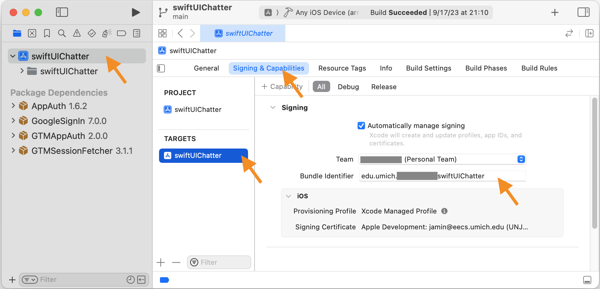 Bundle ID. For this we need to navigate to the Xcode project and get theBundle Identifierunder the Project Information (first top icon on the Xcode left pane). Click onTARGETS > swiftUIChatter, on the tab menu, click onSigning & Capabilities. Copy and paste the bundle identifier (screenshot). The Bundle ID of your Xcode project must match EXACTLY the Bundle ID used for the OAuth client. - Click