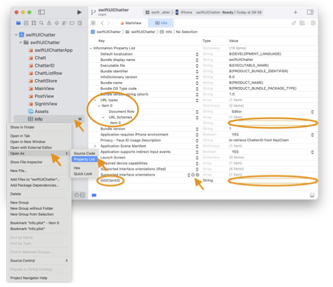 Next we add your CLIENT_ID and a URL Scheme to Xcode, as required by Google Sign-in: