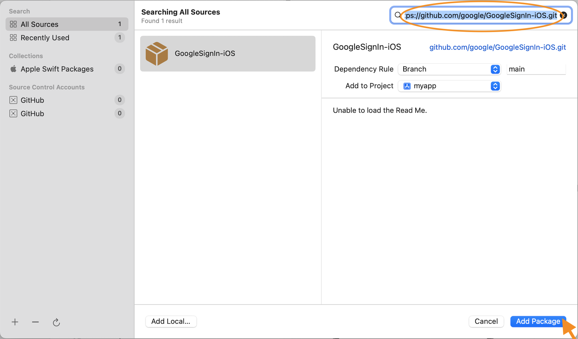 Apple Swift Packageswindow, enter the URL:https://github.com/google/GoogleSignIn-iOSand - click the