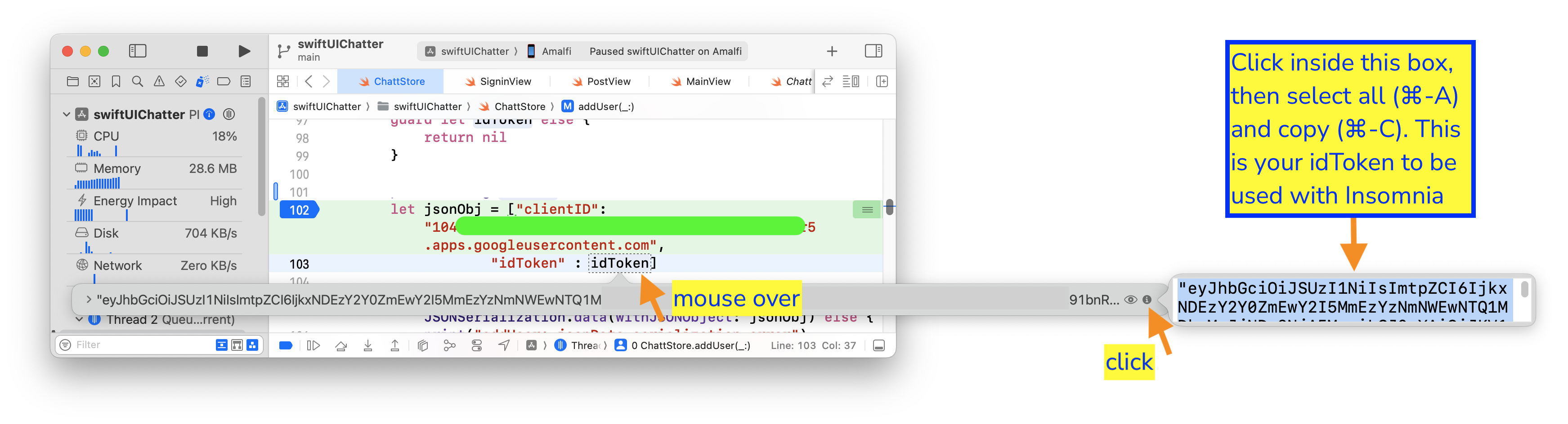 Every time we obtain a new chatterID from the backend, we save it to the Keychain: in the getChatterID(_:) function of your SigninView, after successful return from addUser(_:errMsg:), replace the comment, // save chatterID, with the following: