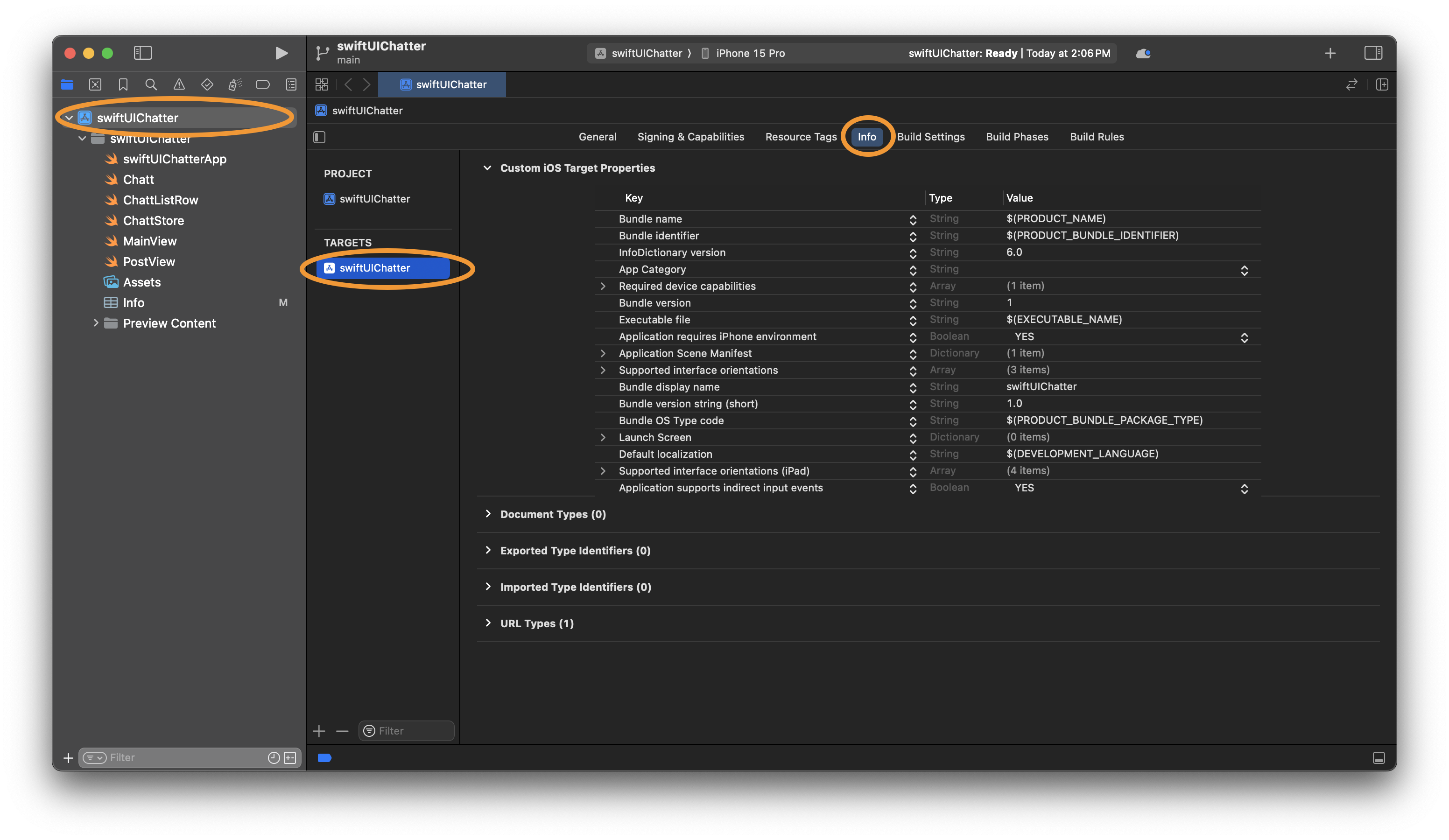 swiftUIChattertop open up the project properties, make sureswiftUIChatteris selected underTARGETS, then navigate toInfoin the navigation bar (screenshot). - Click the